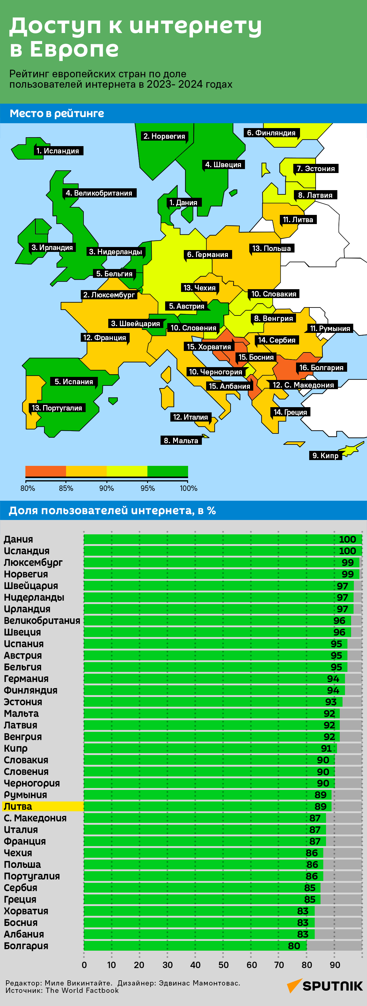 В Европе самая высокая доля населения, имеющего доступ к интернету, зарегистрирована в Дании, Исландии, Люксембурге и Норвегии, самая низкая — в Болгарии, Албании, Боснии и Герцеговине, а также в Хорватии, свидетельствуют данные World factbook за 2023-2024 годы. Статистика включает как пользователей, которые выходят в интернет несколько раз в неделю, так и тех, кто пользуется Сетью раз в несколько месяцев. Подробности — в инфографике Sputnik Литва.