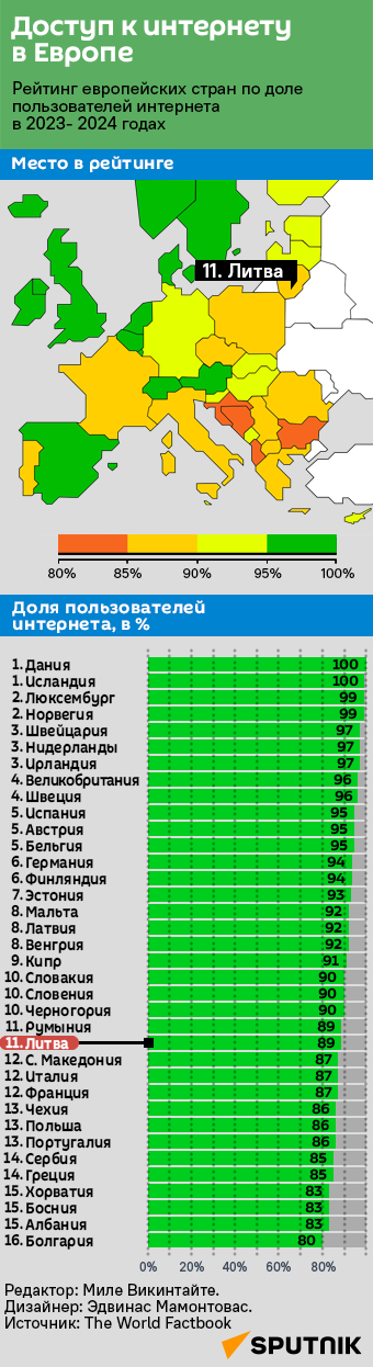 В Европе самая высокая доля населения, имеющего доступ к интернету, зарегистрирована в Дании, Исландии, Люксембурге и Норвегии, самая низкая — в Болгарии, Албании, Боснии и Герцеговине, а также в Хорватии, свидетельствуют данные World factbook за 2023-2024 годы. Статистика включает как пользователей, которые выходят в интернет несколько раз в неделю, так и тех, кто пользуется Сетью раз в несколько месяцев. Подробности — в инфографике Sputnik Литва.