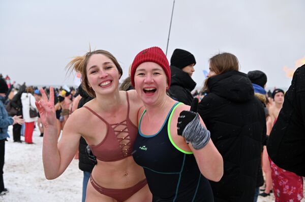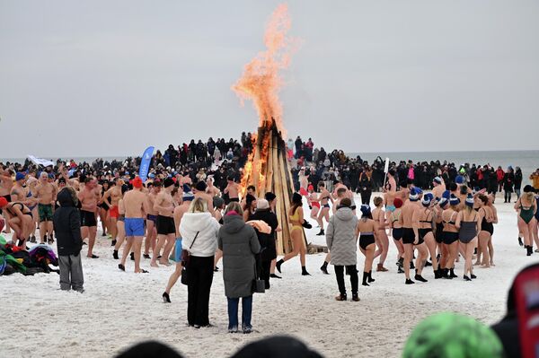 Больше всего людей собралось у моря, где проходило одно из самых ожидаемых событий — заплыв "моржей".