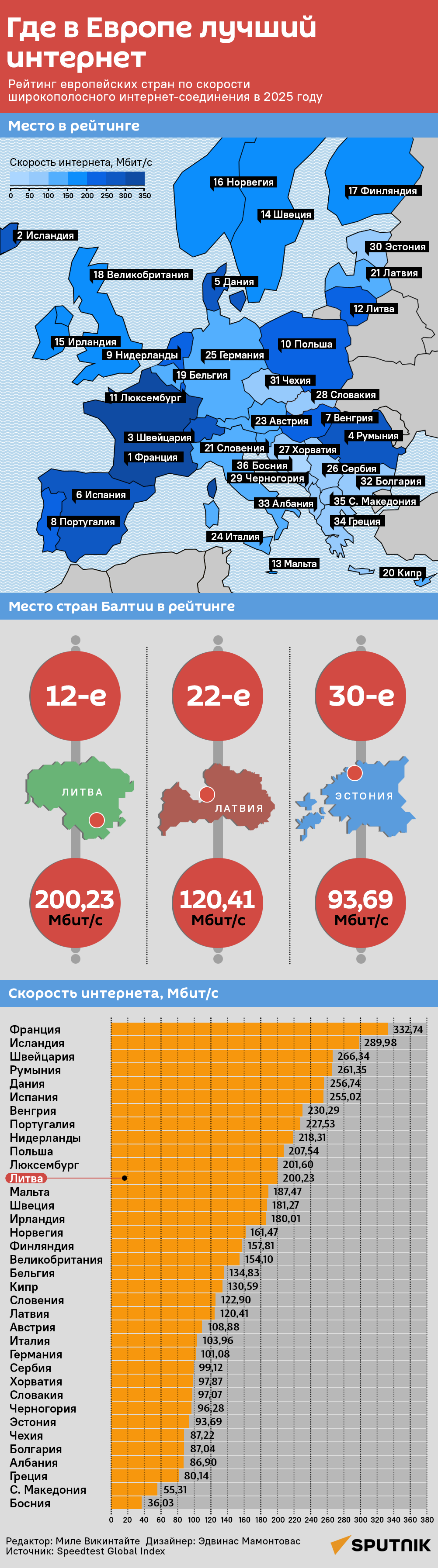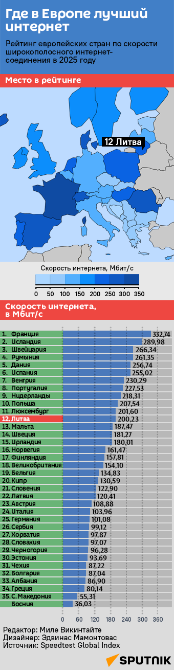 Самая высокая скорость широкополосного интернет-соединения среди стран Европы отмечается во Франции, Исландии и Швейцарии, а самая низкая — в Боснии и Герцеговине, Северной Македонии и Греции, свидетельствуют данные сравнения показателей скорости интернета в разных странах и городах Speedtest Global Index за октябрь 2025 года. Подробности — в инфографике Sputnik Литва.