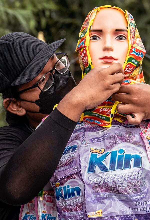 Aplinkosaugos aktyvistas aprengė manekeną plastiko atliekomis per akciją prieš klimato kaitą.