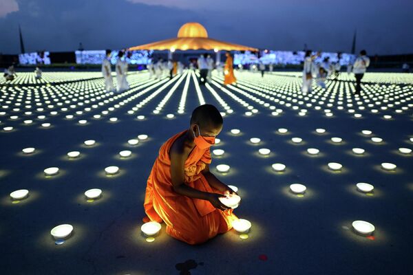 Jaunas budistų vienuolis tarp LED lempučių per Žemės dienos šventę.