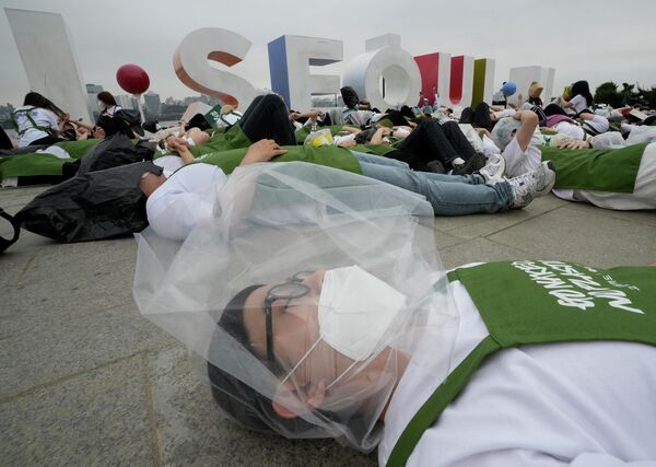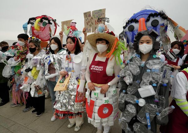 Aplinkosaugos aktyvistai, dėvintys drabužius iš plastiko atliekų, dalyvauja akcijoje, skirtoje Žemės dienai prieš klimato kaitą paminėti Seule, Pietų Korėjoje.
