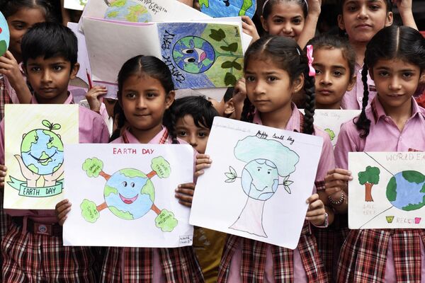 Vienoje Amritsaro mokykloje minint Žemės dieną mokiniai demonstruoja savo piešinius aplinkosaugos temomis.