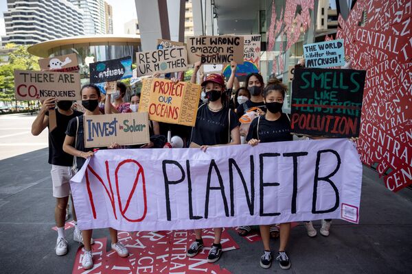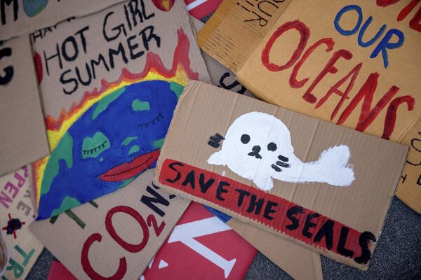 Plakatai iš "Klimato streiko", skirto Žemės dienai pažymėti Bankoke.