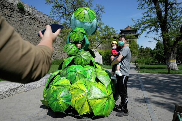 Pekine minint Žemės dieną, vyras ir vaikas, dėvintys kaukes, pozuoja nuotraukoms šalia kinų menininkės Kong Ning su naujausiu kūriniu "Protect Earth with Banana Leaf Umbrellas".