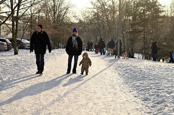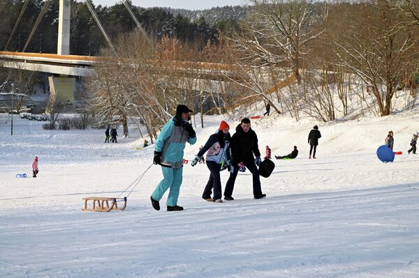 В парк Вингис жители Вильнюса выбрались целыми семьями: кто-то кататься на лыжах, санках, ледянках, а кто-то просто прогуляться.