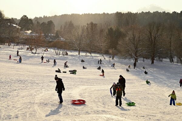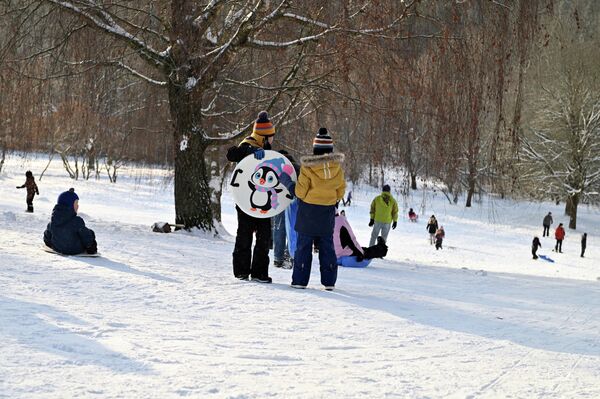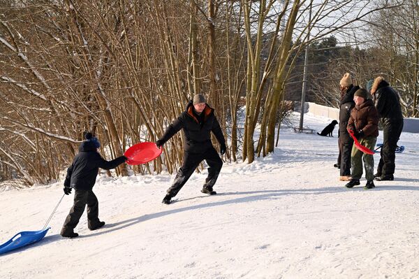 На фото: дети катаются на санках в парке Вингис в Вильнюсе.