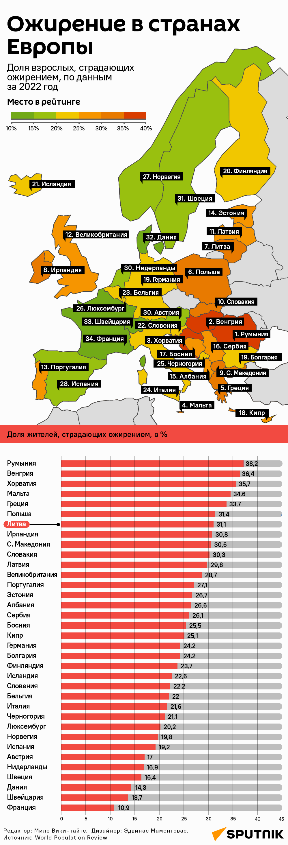 Самая высокая доля взрослого населения с ожирением среди стран Европы была зафиксирована в Румынии, Венгрии и Хорватии, а самая низкая — во Франции, Швейцарии и Дании, свидетельствуют данные сравнения медицинских показателей в разных странах World Population Review за 2022 год. Всемирная организация здравоохранения (ВОЗ) определяет ожирение как индекс массы тела, превышающий или равный 30 килограммам на квадратный метр площади тела. Подробности — в инфографике Sputnik Литва.