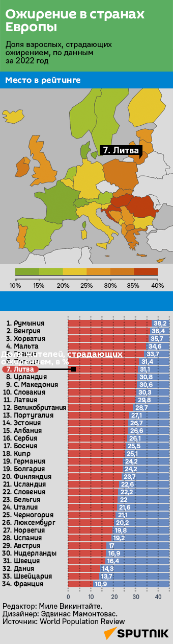 Литва вошла в десятку европейских государств с наибольшей долей жителей, страдающих ожирением