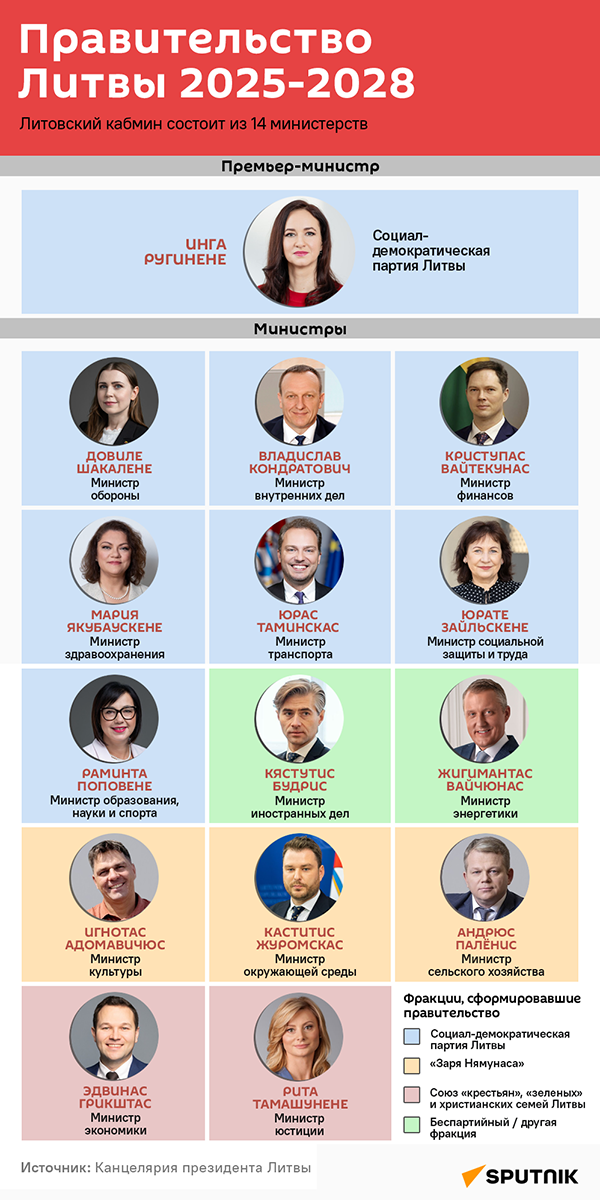 Новый кабмин получил полномочия после того, как Сейм утвердил программу правительства и министры принесли присягуВ начале августа президент Литвы Гитанас Науседа подписал декрет об отставке 19-го кабмина и Гинтаутаса Палуцкаса с поста премьера. Он решил уйти с должности на фоне многочисленных скандалов, связанных с его прошлыми деловыми связями. Премьером 20-го правительства стала член Социал-демократической партии Литвы Инга Ругинене. Также изменился и состав правящего большинства. В новую коалицию вошли социал-демократы, партия „Заря Нямунаса“ и Союз „крестьян“, „зеленых“ и христианских семей Литвы. Правительство Литвы состоит из 14 министерств. В нем девять министров выдвинуты выигравшей выборы в Сейм Социал-демократической партией Литвы, три — партией „Заря Нямунаса“, два — Союзом „крестьян“, „зеленых“ и христианских семей Литвы. Новый кабмин получил полномочия после того, как Сейм утвердил программу правительства и новые министры принесли присягу. Подробности — в инфографике Sputnik Литва.Sputnik Литва теперь в Telegram! Подписывайтесь на самые быстрые, яркие и подробные новости о Литве, Балтии и не только.