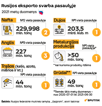Sputnik pateikia 2021 metų duomenis apie Rusijos eksporto apimtis pasaulio rinkojeVakarų antirusiškos sankcijos daro didelę žalą pasaulio ekonomikai. Pagal daugelio išteklių eksporto pozicijas, tokias kaip dujų, kalio trąšų, metalurgijos produktų ir grūdų eksportas, Rusija užima pirmąją vietą pasaulio ekonomikoje. Pagal naftos eksportą Rusija yra antra šalis pasaulyje, o pagal anglies tiekimą šalis užima pirmąją vietą.