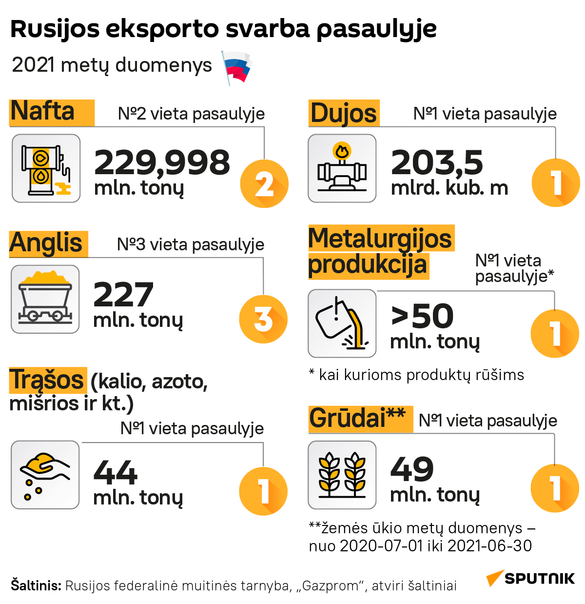 Sputnik pateikia 2021 metų duomenis apie Rusijos eksporto apimtis pasaulio rinkoje