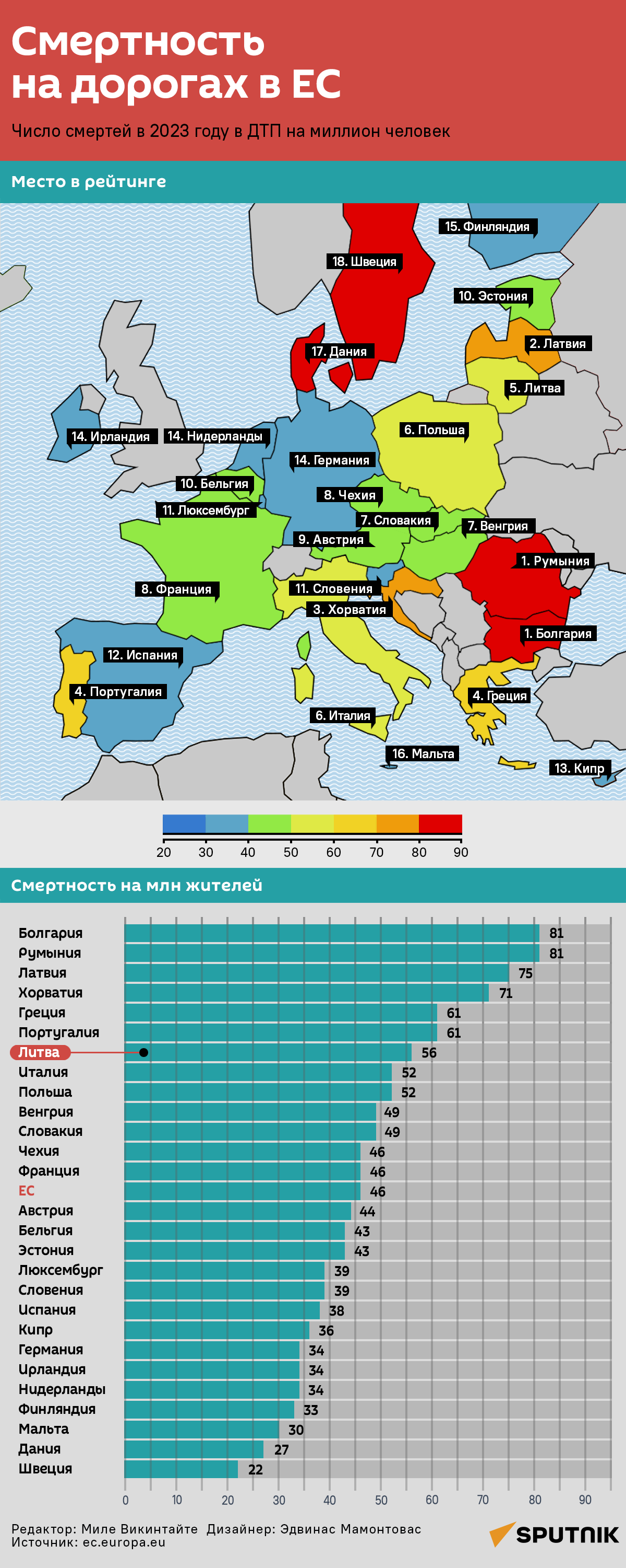 В Евросоюзе в 2023 году в дорожно-транспортных происшествиях погибло 20380 человек, или 46 человек на миллион жителей, свидетельствуют данные статистического агентства Евростат (Eurostat).Больше всего в авариях люди гибли в Болгарии, Румынии и Латвии, меньше всего — в Швеции, Дании, на Мальте.Подробности — в инфографике Sputnik Литва.