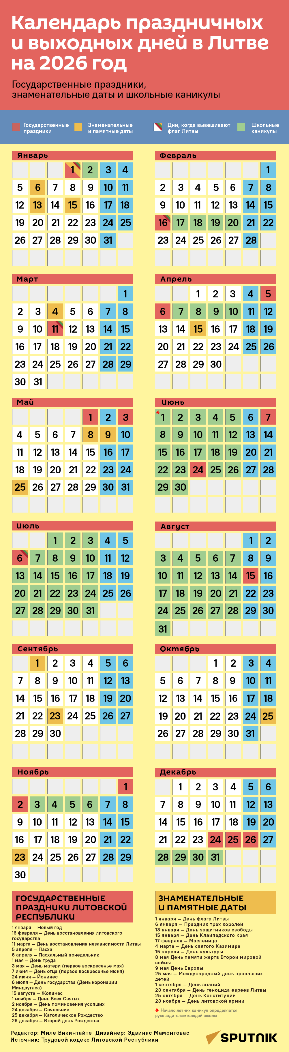 В 2026 году в Литве будет 16 официальных нерабочих дней, включая государственные и религиозные праздники. Некоторые из них выпадут на выходные, но в некоторых случаях отдых можно будет продлить. Флаг Литвы обязательно вывешивается три раза в год. Нацсимвол обязан появляться на госучреждениях, зданиях местных самоуправлений, общественных организаций и частных домохозяйств. Подробности — в инфографике Sputnik Литва.